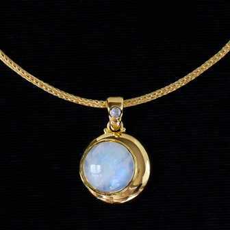 "The Eclipse Gold Necklace is a wonderful work of art! It looked exactly as described and has a mystical feel that I was seeking. The quality of the moonstone and gold pendant and gold chain are fantastic. The item is sturdy, meant to last for a long time. It's beautiful!" -George